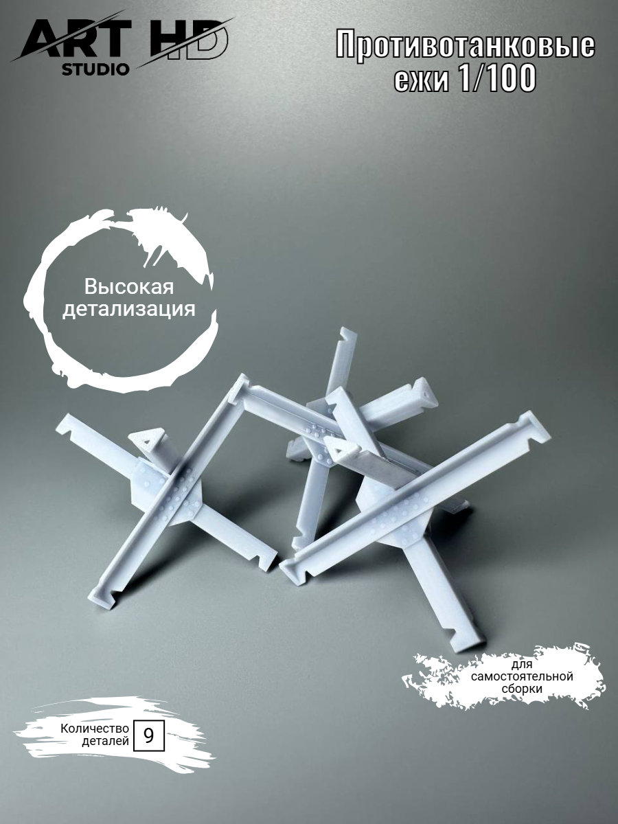 В комплекте 9 предметов, противотанковые ежи поставляются в разобранном виде и требуют склейки любым секундным клеем.